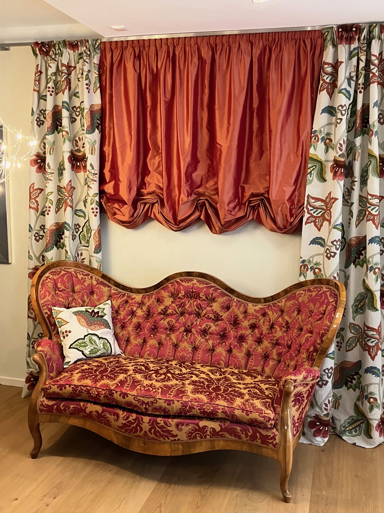 Wiener Barock Sofa um 1840 traditionell aufgepolstert. Kombiniert mit einer klassischen Fensterdekoration und einem Wolkenstore.