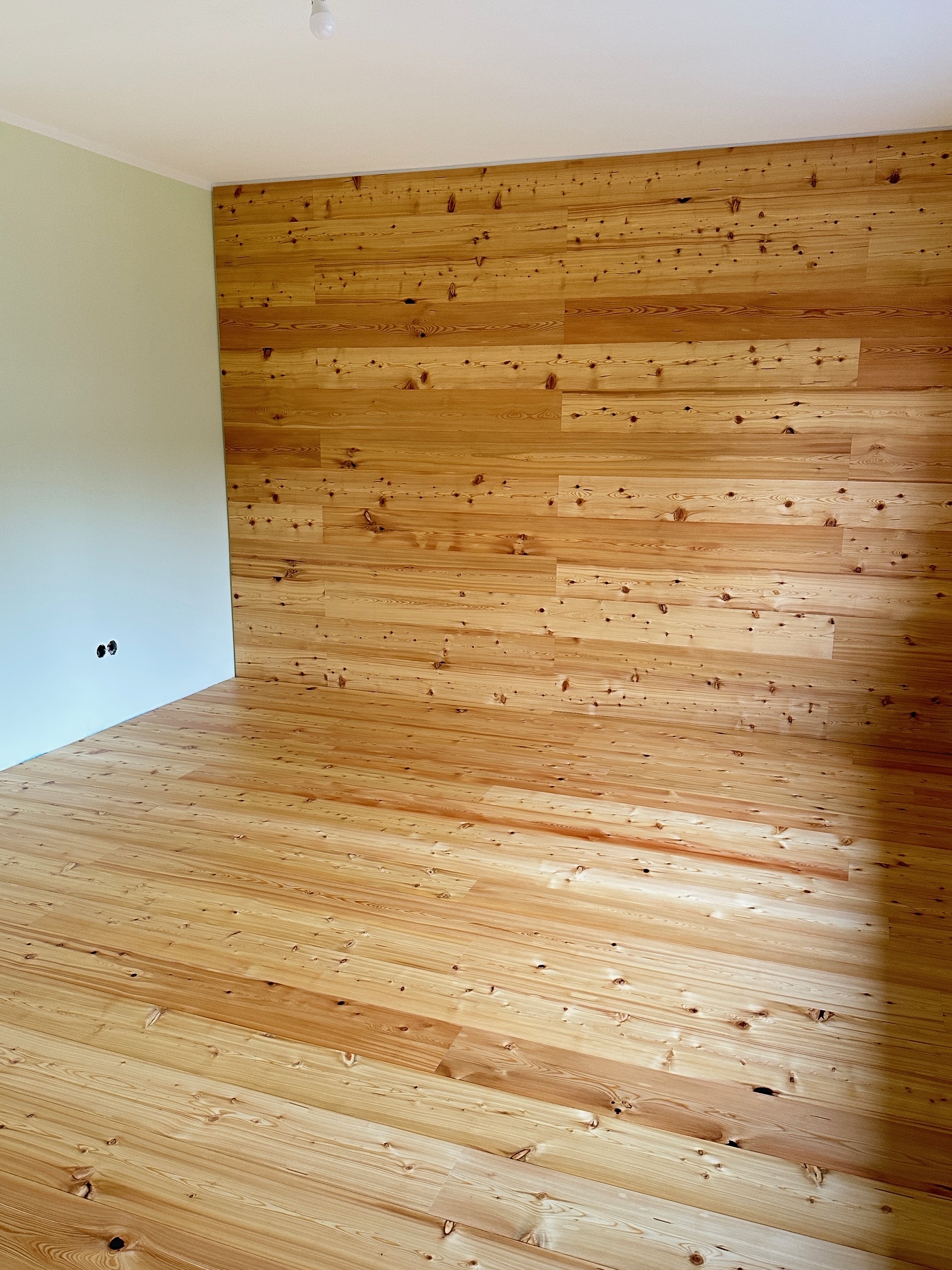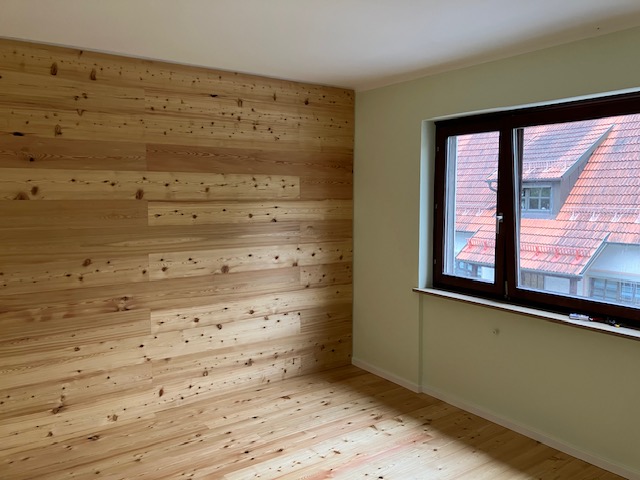 Holz als durchgängiges Gestaltungselement für Boden und Wand. Gespachtelte, tapezierte und gestrichene Wand- und Deckenflächen sowie maßgefertigte Plissees schaffen ein stimmiges Gesamtbild.