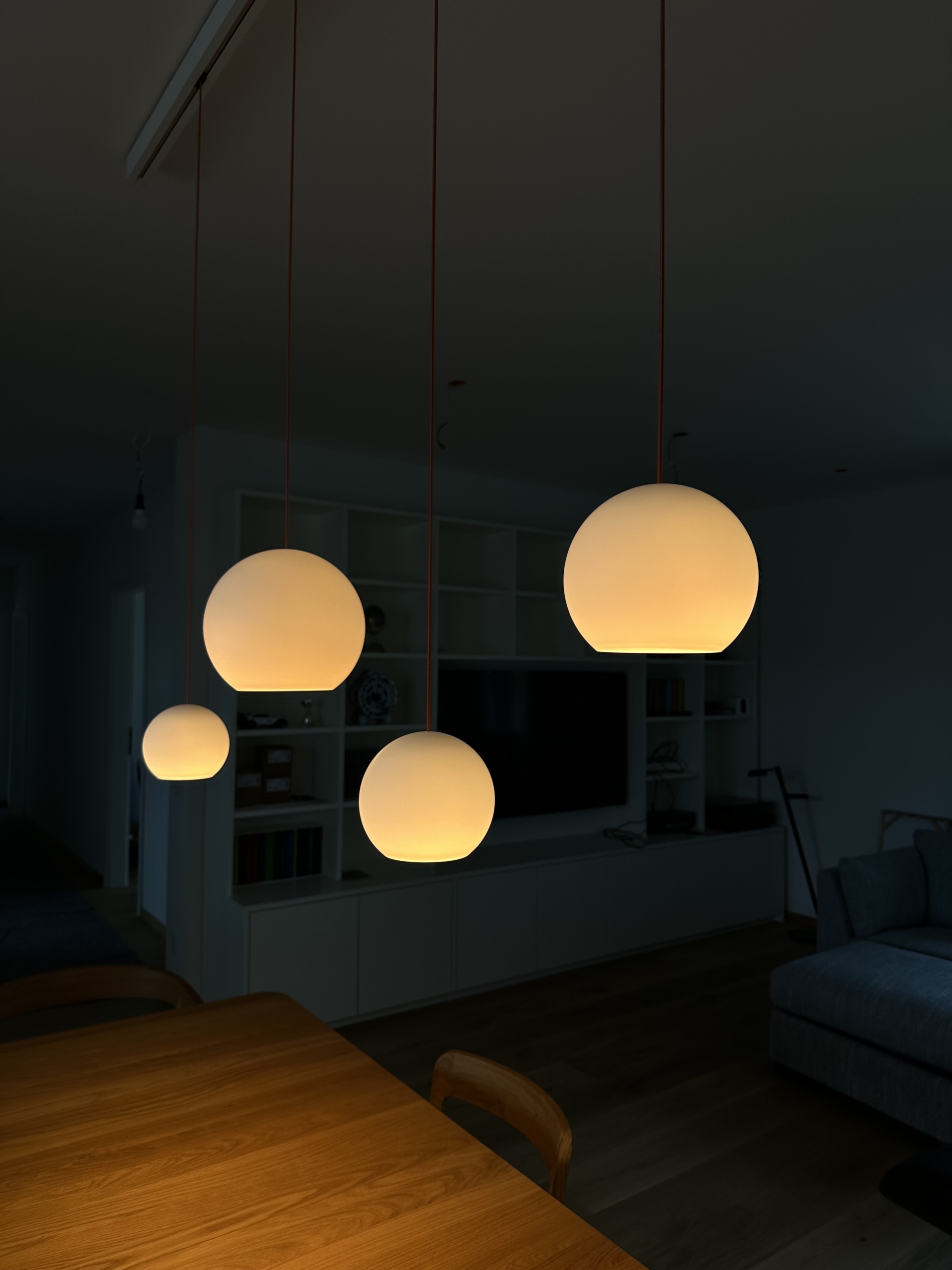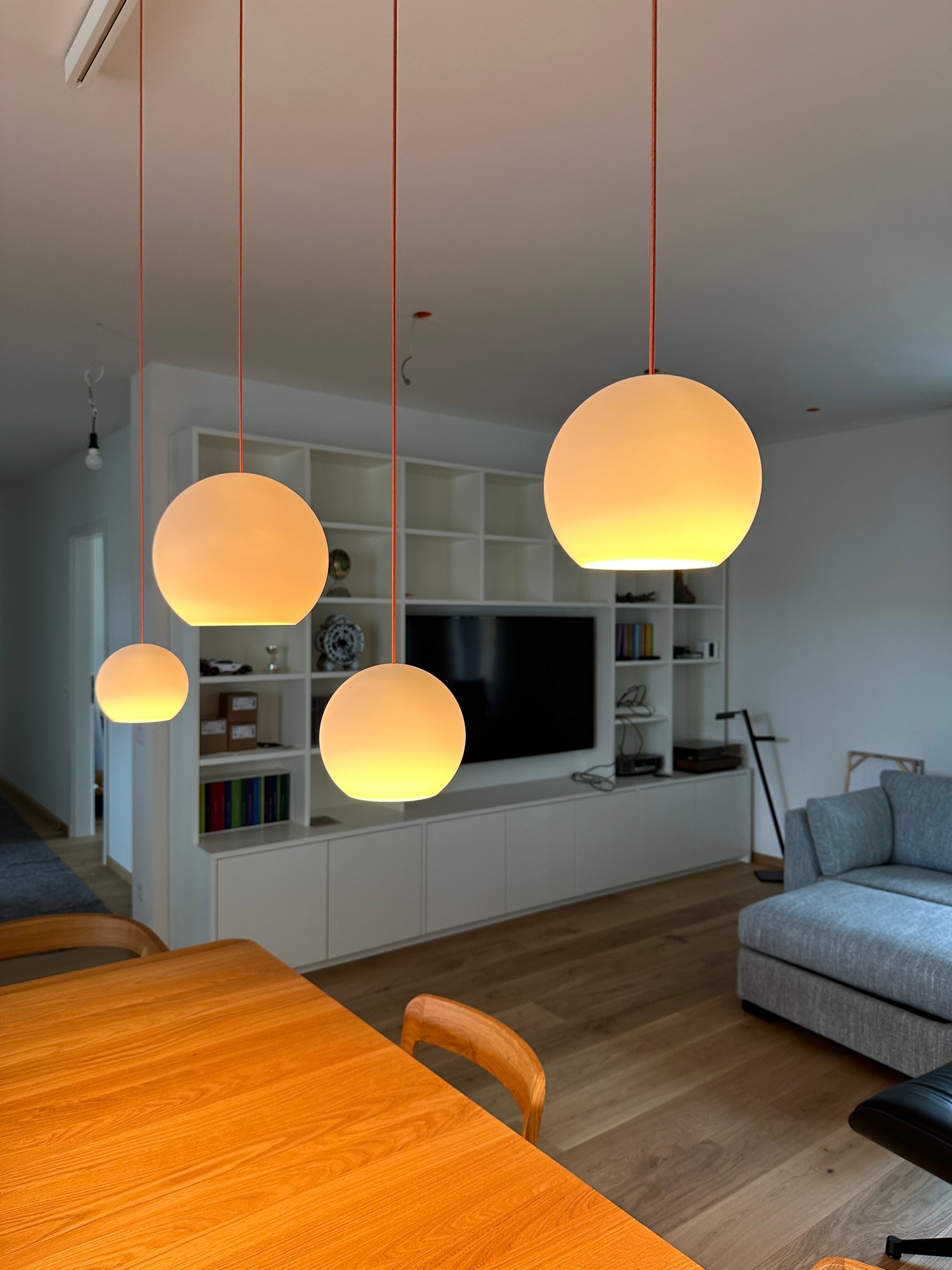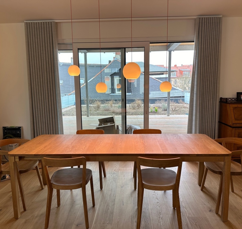 Installation einer dimmbaren und höhenverstellbaren Hängeleuchte von Komot. Die flexible Leuchtenlösung ermöglicht eine individuelle Anpassung von Lichtstimmung und Position im Raum.